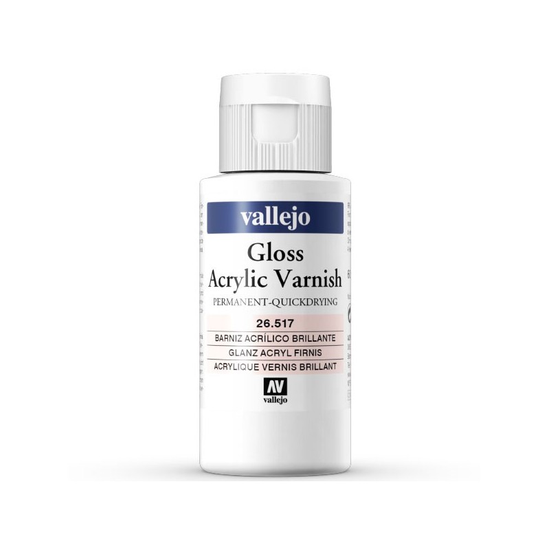 Barniz Acrílico Brillante de Vallejo 26517: secado rápido, acabado brillante permanente y protección UV. Ideal para aerógrafo o pincel. ¡Haz tu pedido en CraftyMinis!