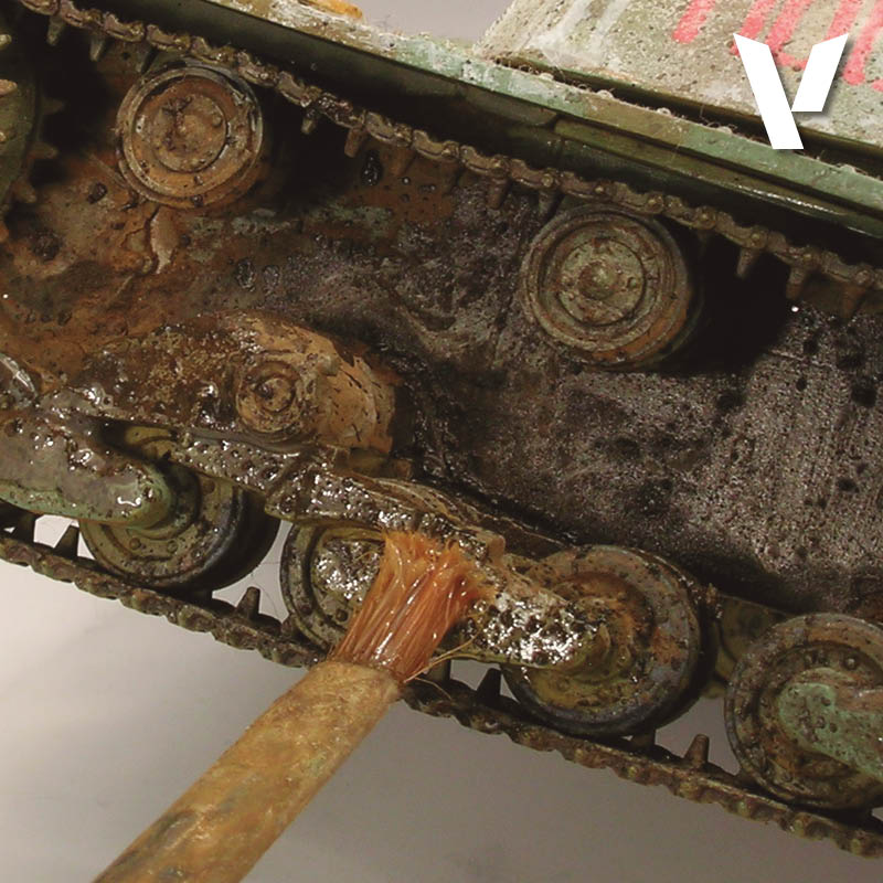 Sellar empolvados en bajos, chasis, orugas y llantas sin perder textura.